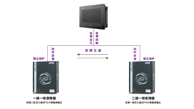 ZLS-2iC二級壓縮空壓機啟動后,由顯控一體機發出啟動命令通過高速通訊協議,確保兩級間的快速響應同時啟動兩臺一體變頻器,變頻器啟動后,由變頻器內部控制系統獨立控制各級的壓力變送器直接接在一體變頻器上,壓力讀取、PID響應速度更快,確保能夠快速恒壓。協調工作同啟同停,任意一臺空壓機停機或出現故障時,另外一臺立即跟隨停機。即便是通訊線斷了,一體空壓機也能獨立保護,根據傳感器監測的數值,做出保護停機的動作。